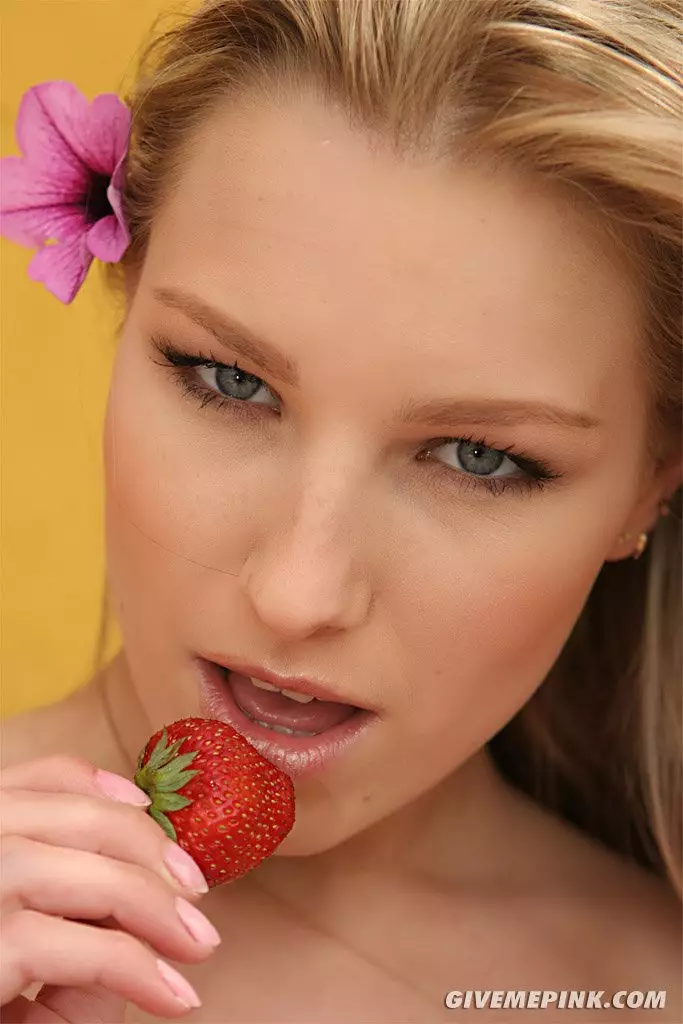 Соблазнительная блондинка в розовом Katy Caro ест клубнику и возбуждающе позирует — Katy Caro
