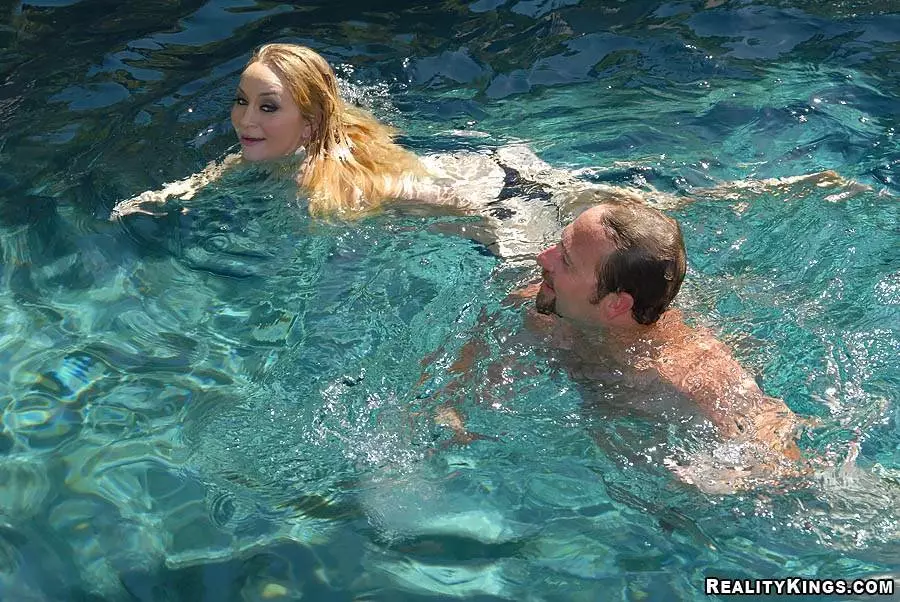 Похотливая белокурая матрона Aiden Starr в чулках занимается любовью в бассейне со счастливым мужиком — Aiden Starr