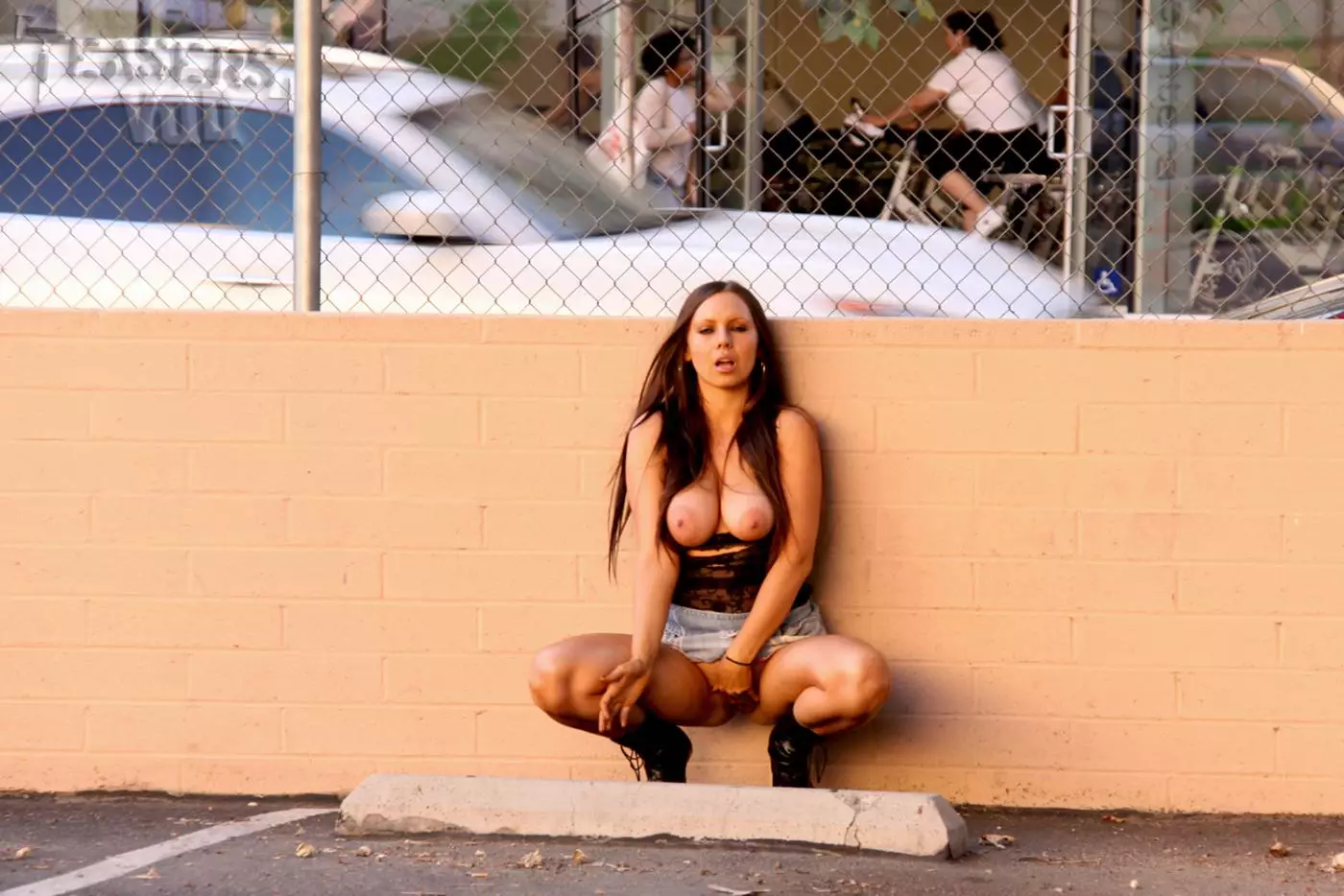 Брюнетка с большими натуральными сиськами и гладкой киской - Alektra Sky, гуляет по улице обнаженной — Alektra Sky