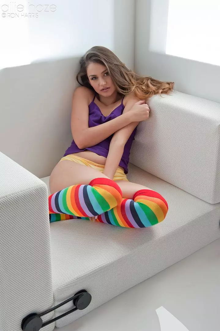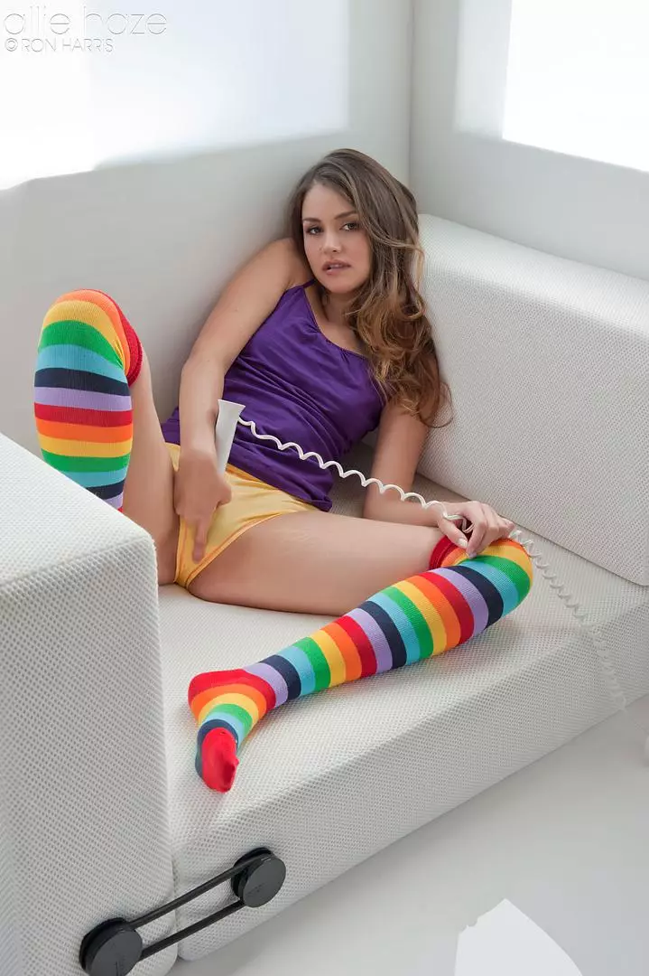 Горячая брюнетка в чулках цвета радуги - Allie Haze, снимает свою одежду и играет с собой — Allie Haze