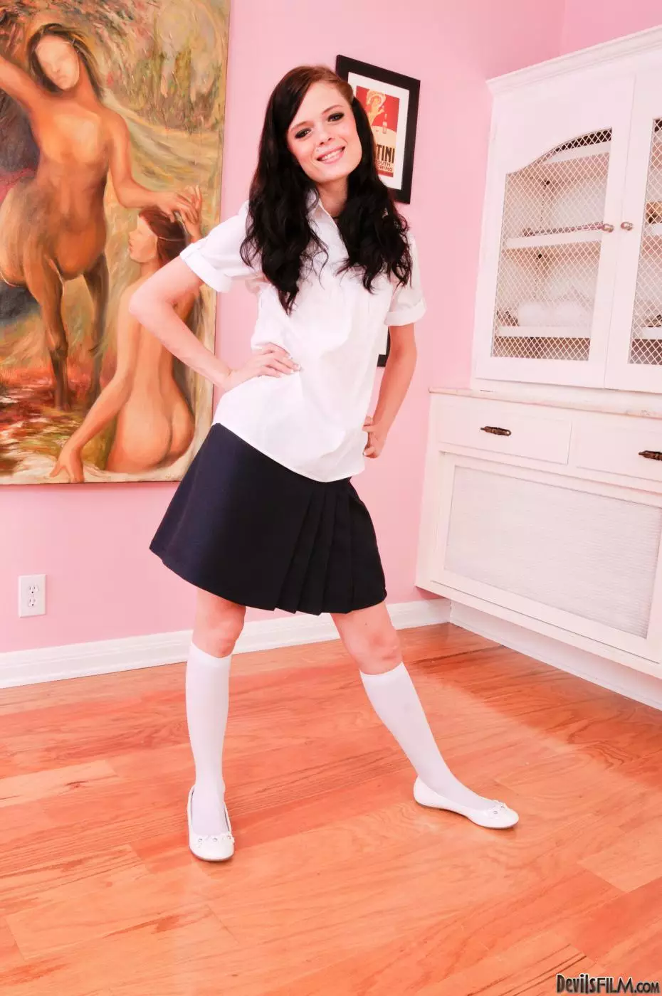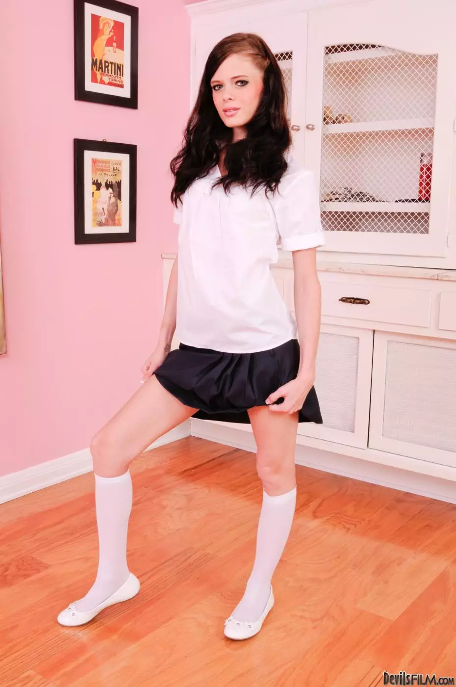 Молоденькая брюнетка Angelina Black показывает свои сиськи в лифчике под блузкой и трусики под юбкой — Angelina Black