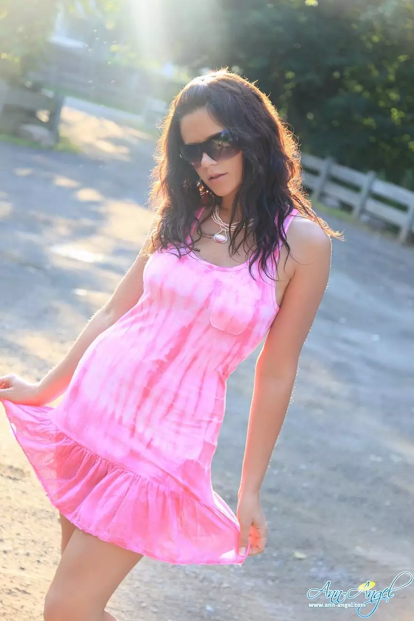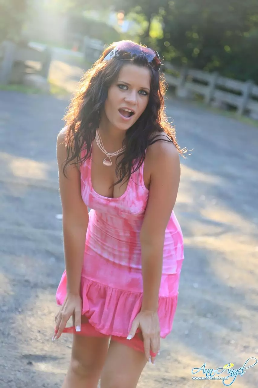 Игривая брюнетка в розовой мини-юбке Ann Angel показывает сексуальную попку и грудь на природе — Ann Angel