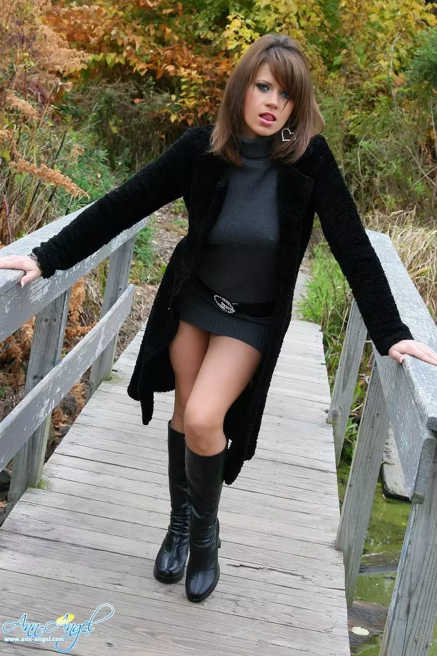 Игривая брюнетка Ann Angel раздевается до стрингов на деревянном мосте в парке — Ann Angel