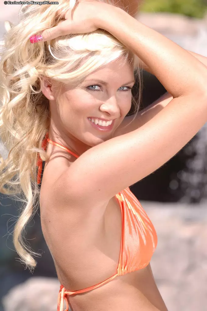 Очаровательная зрелая блондинка с лысой киской Brandi Edwards снимает свое бикини на солнышке — Brandi Edwards