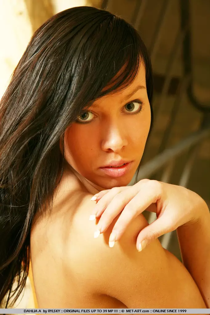 Длинноногая кошечка-брюнеточка в коричневых сапогах Dahlia A показывает свою невероятную крошечную попку — Dahlia A