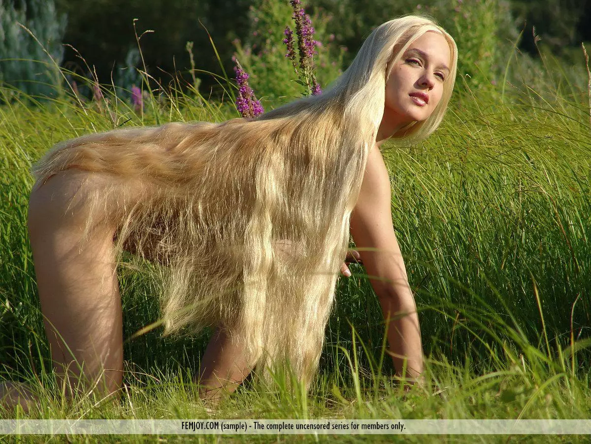 Соблазнительная блондинка Desire A полностью голая среди луговых цветов — Desire A