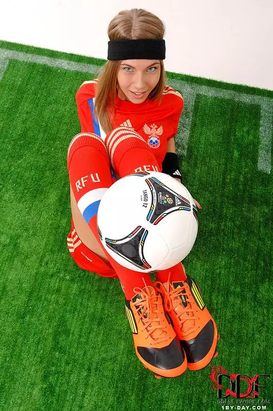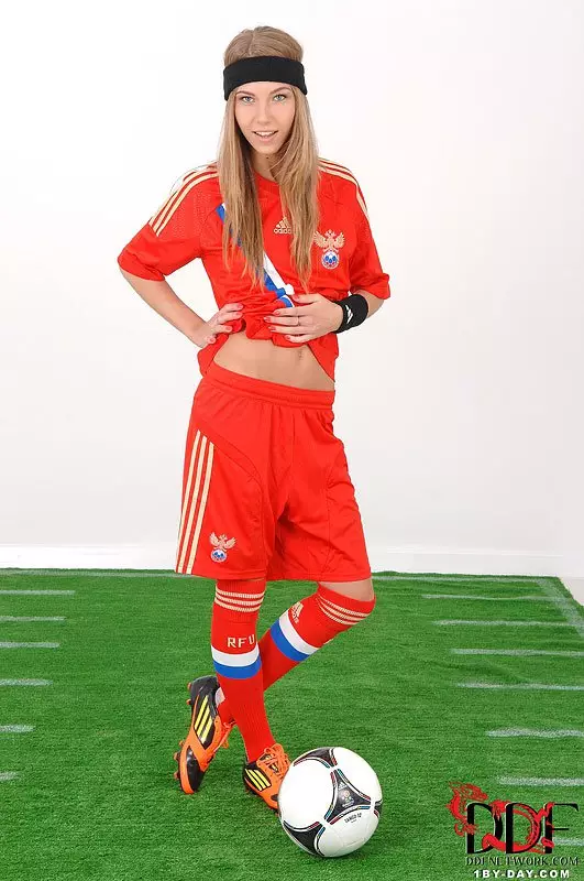 Русская футбольная фанатка Ebbi Nubiles снимает свою красную форму и раздвигает ножки — Ebbi Nubiles