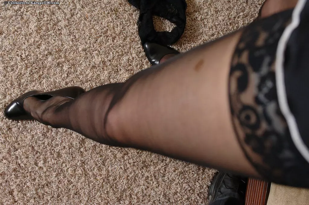 Горничная средних лет Erica Scott в униформе и нейлоновых чулках раздвигает пошире свою волосатую киску — Erica Scott