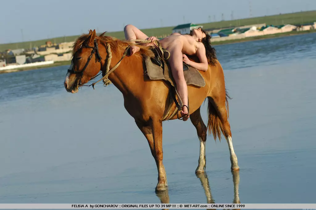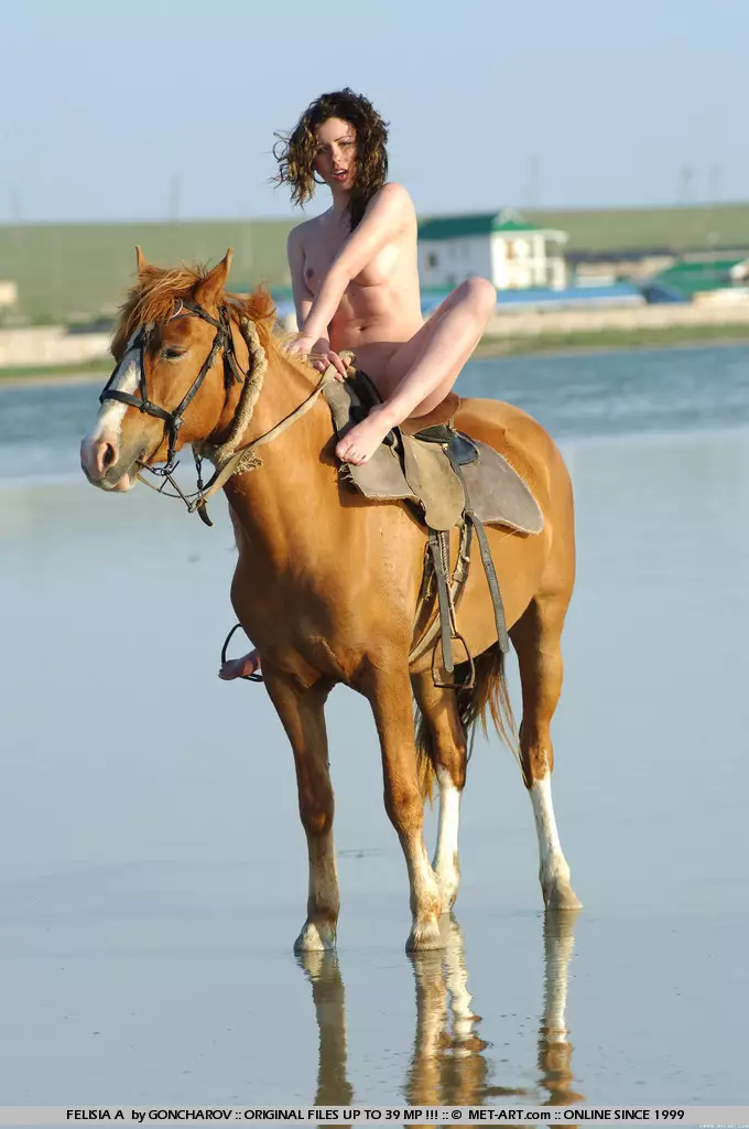 Великолепная брюнетка Felisia A катается на лошади в обнаженном виде у реки — Felisia A