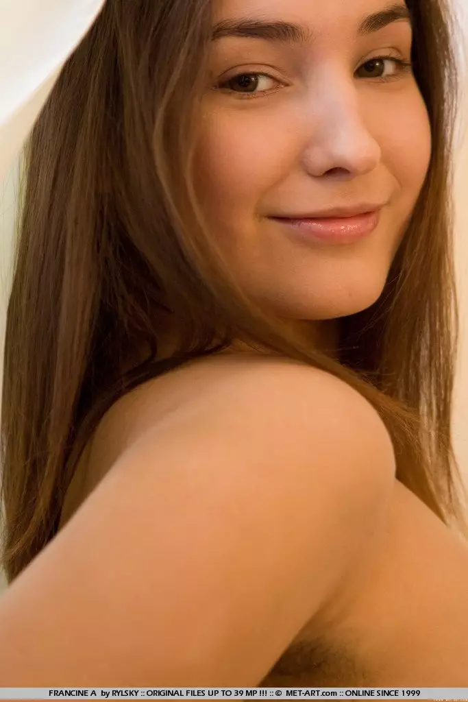 Темноволосая конфетка с волосатой писькой Francine A позирует с раздвинутыми ногами — Francine A