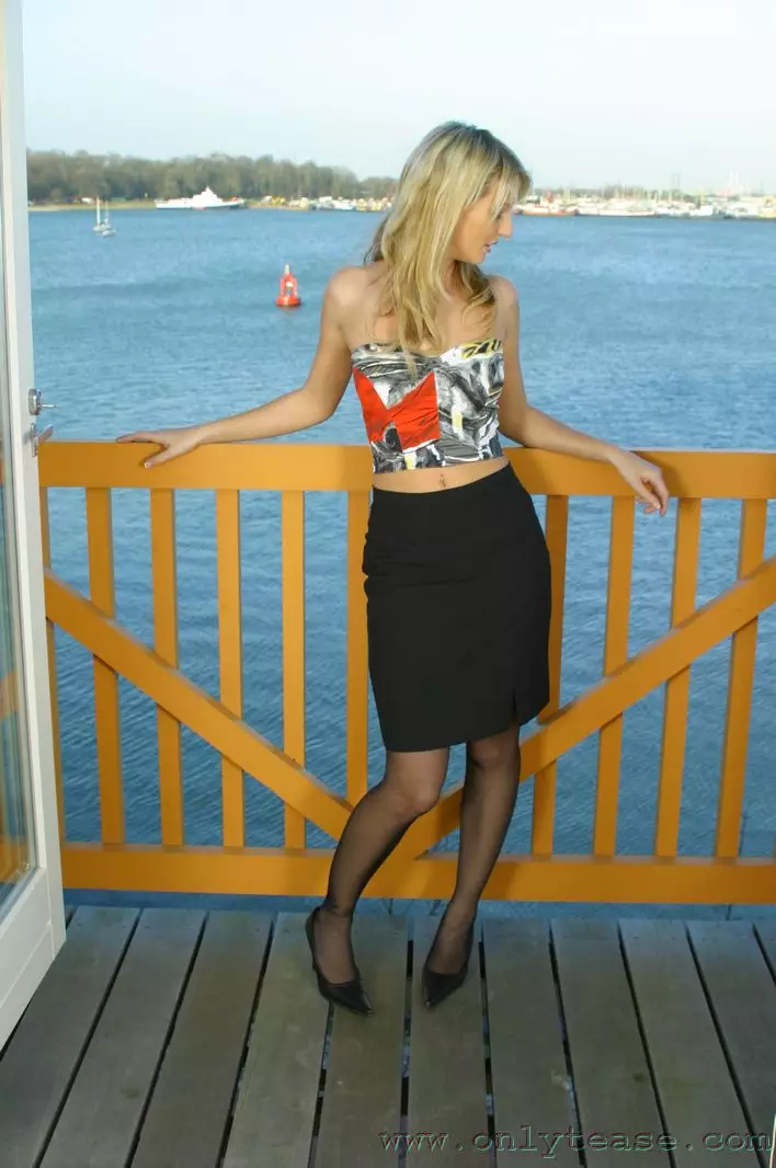 Игривая блондинка в черных чулках на красном поясе - Jamie C, позирует на балконе — Jamie C