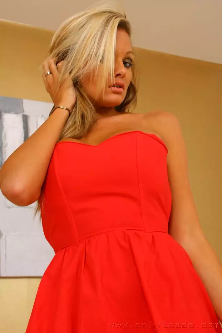 Могучая прекрасная блондиночка Jennifer Onlytease в ярком черном платье и белоснежных чулках — Jennifer Onlytease