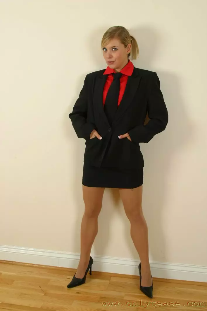Сексуальная куколка Karen Wood в красной блузке и черном нижнем белье показывает откровенный стриптиз — Karen Wood