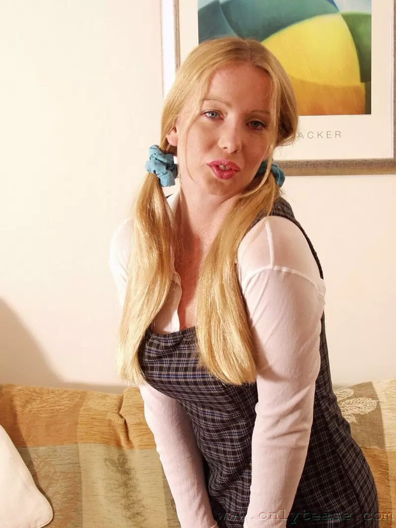 Блондинка Louise Onlytease без трусиков в коротком платье и чулках показывает свою упругую попку и лысую киску — Louise Onlytease