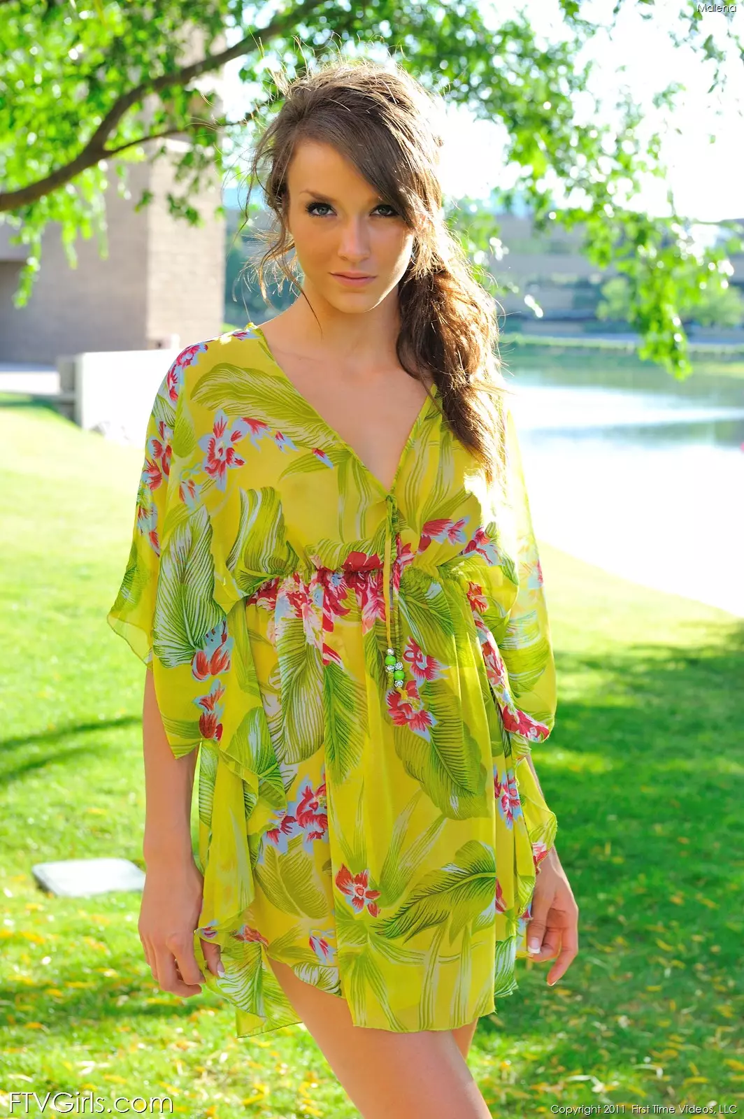 Malena Morgan в красных туфляк и зеленом платье сует игрушку в свою пизду на скамейке в парке — Malena Morgan