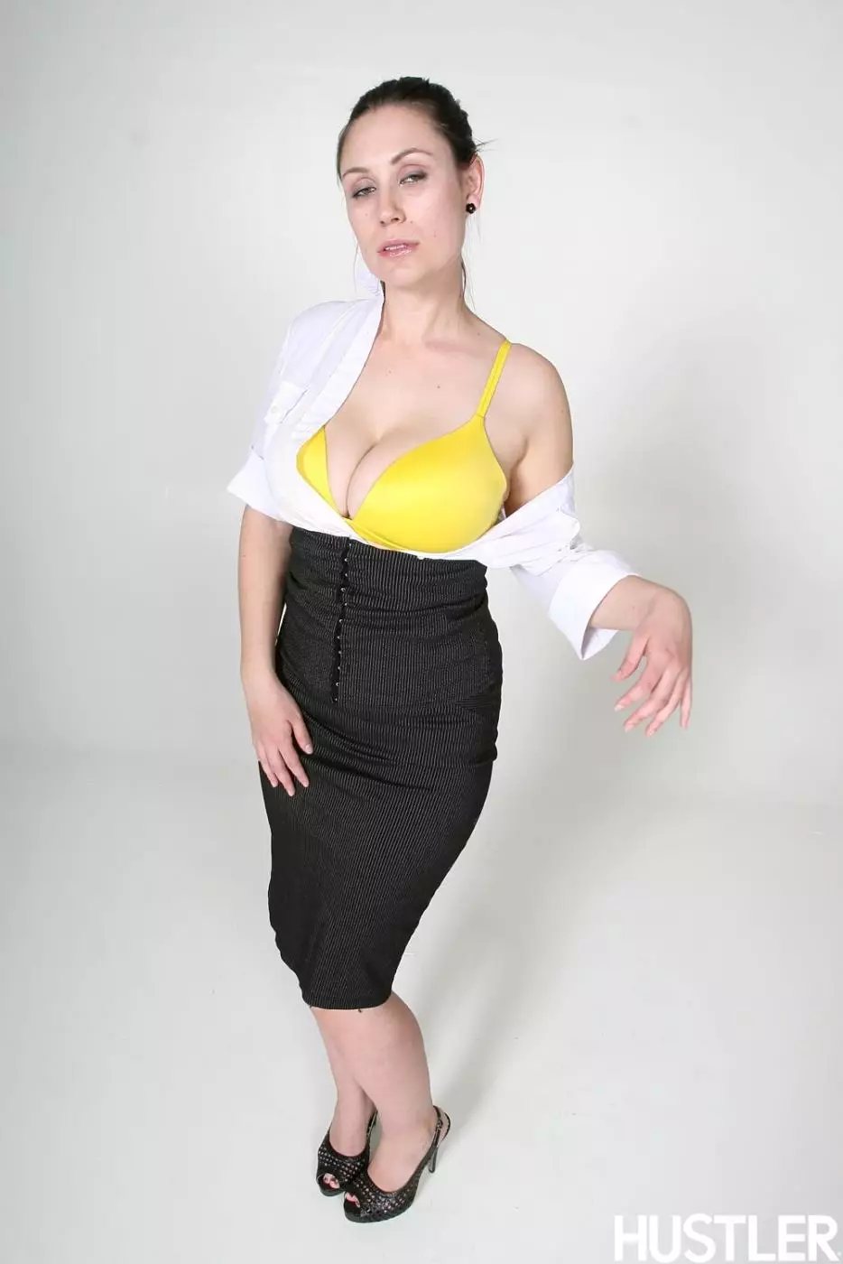 Rucca Page с гигантскими сиськами и волосатой пиздой снимает белую блузку, черную юбку и желтое нижнее белье — Rucca Page