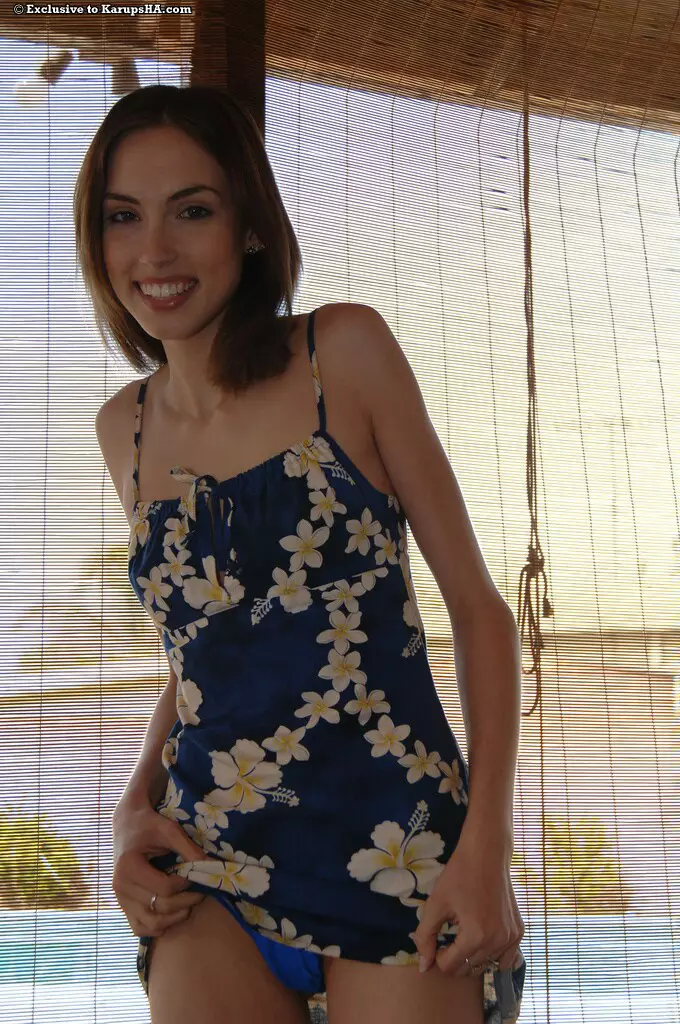Детка с крошечными, твердыми сосочками и бритой киской Sophie Strauss стягивает синие трусики на природе — Sophie Strauss