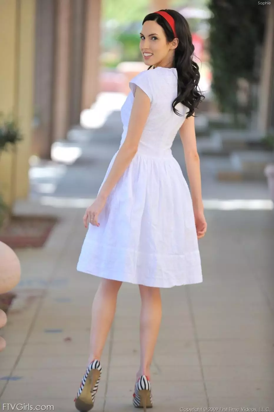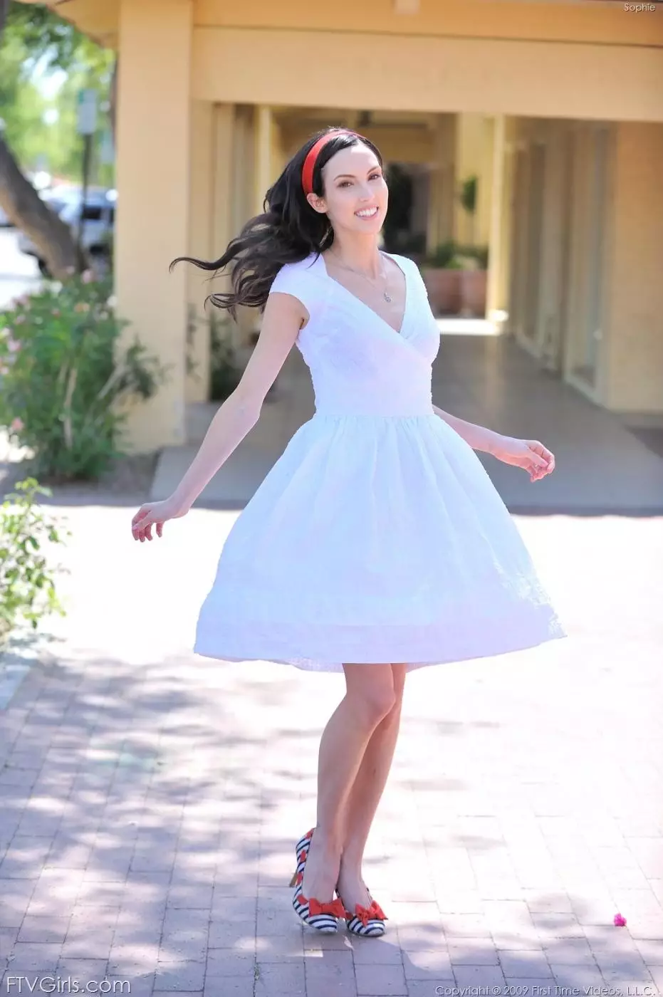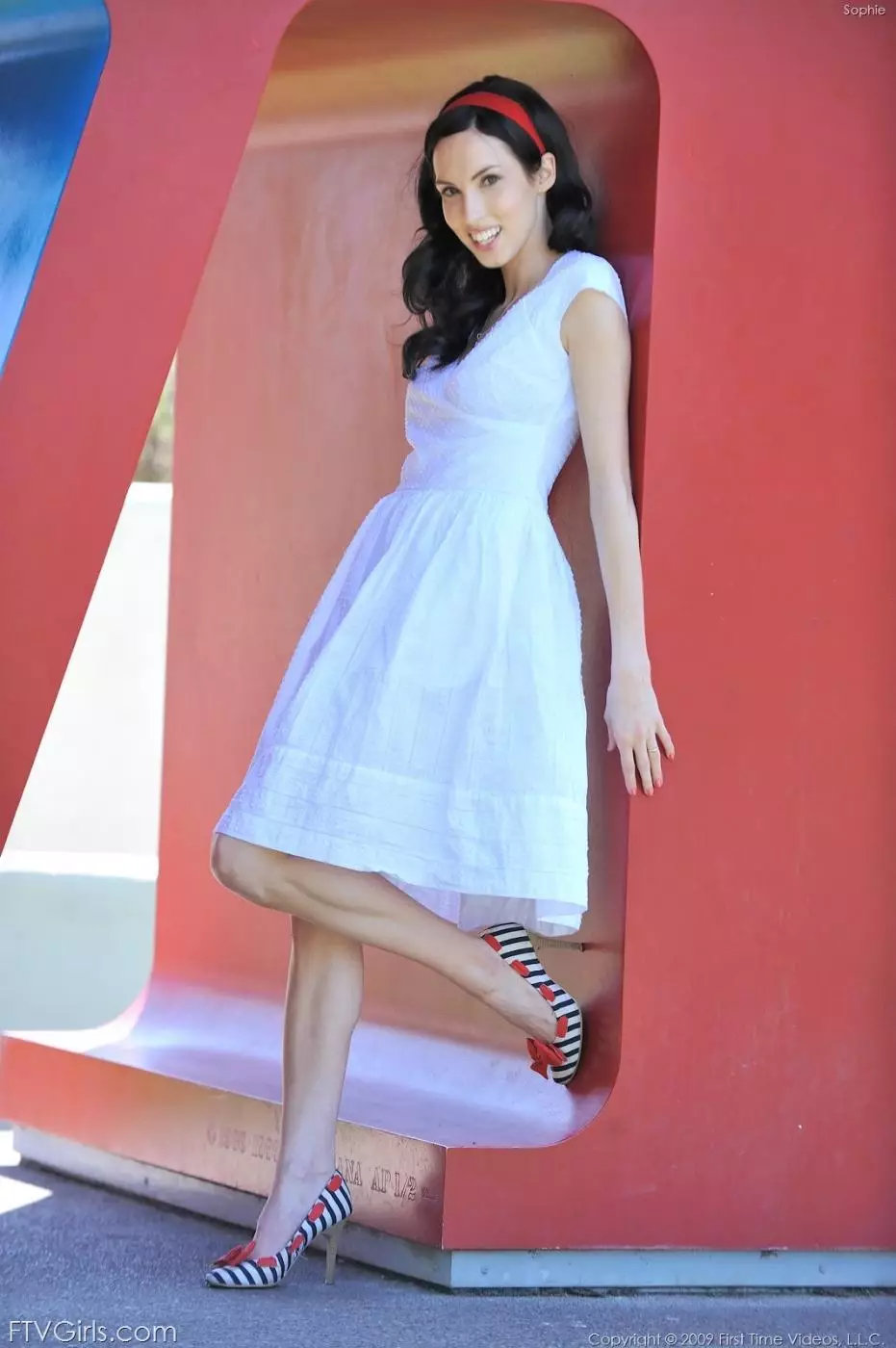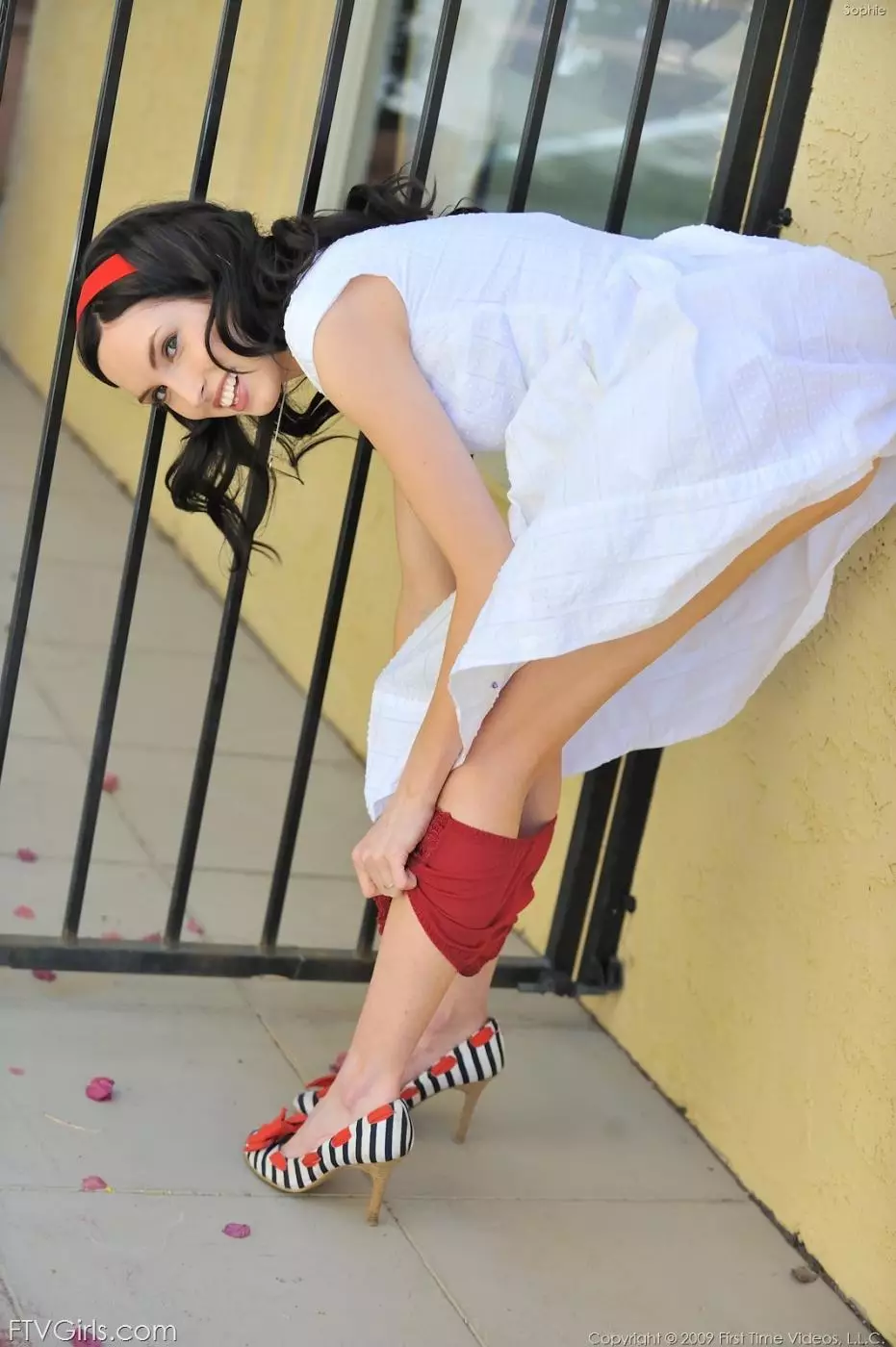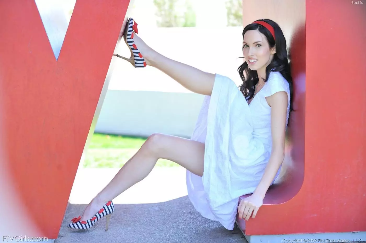 Брюнеточка в белом платье Sophie Strauss снимает красные трусики — Sophie Strauss