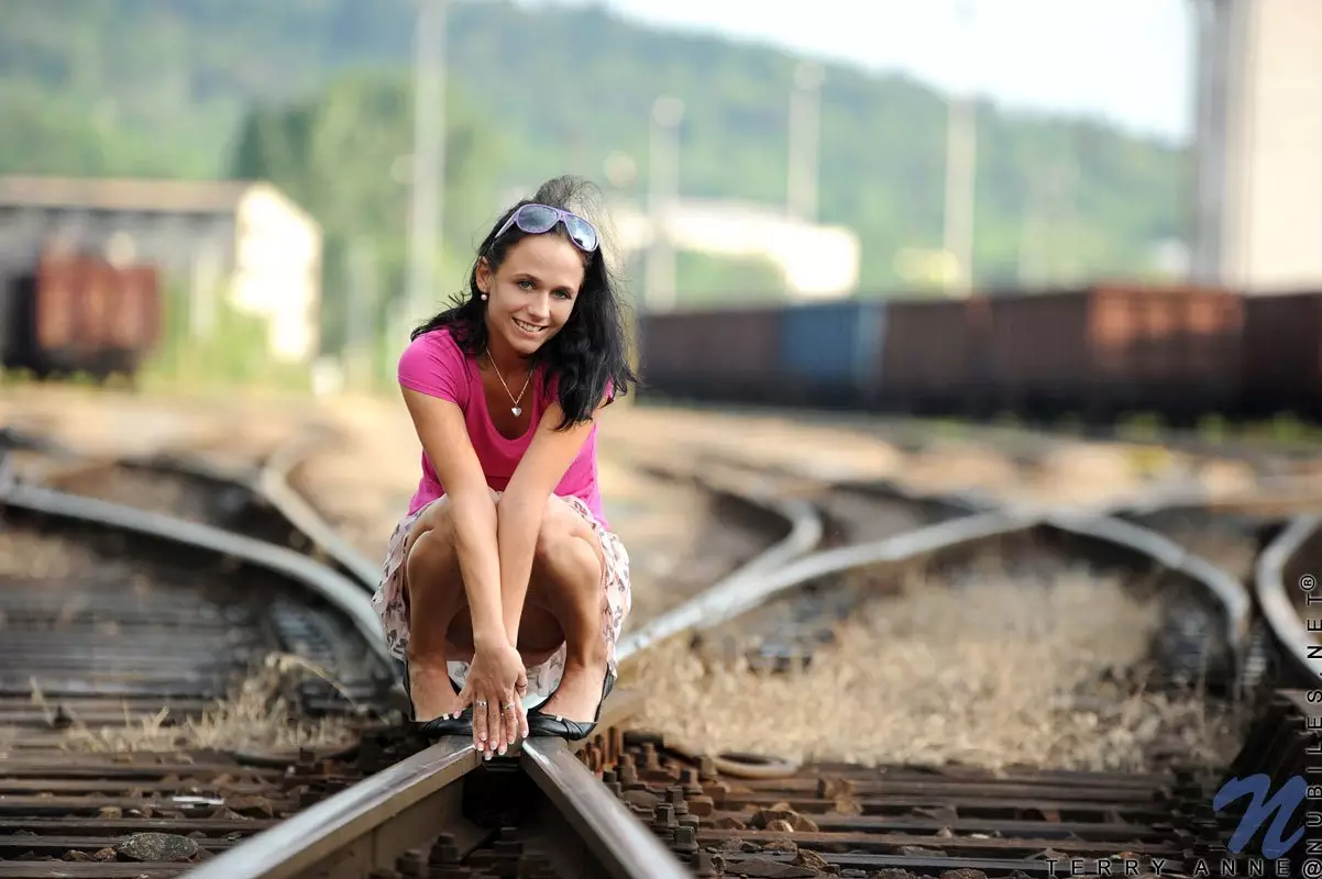 Стройная красотка Terry Anne снимает топ и раскрывает узкую киску на железной дороге — Terry Anne