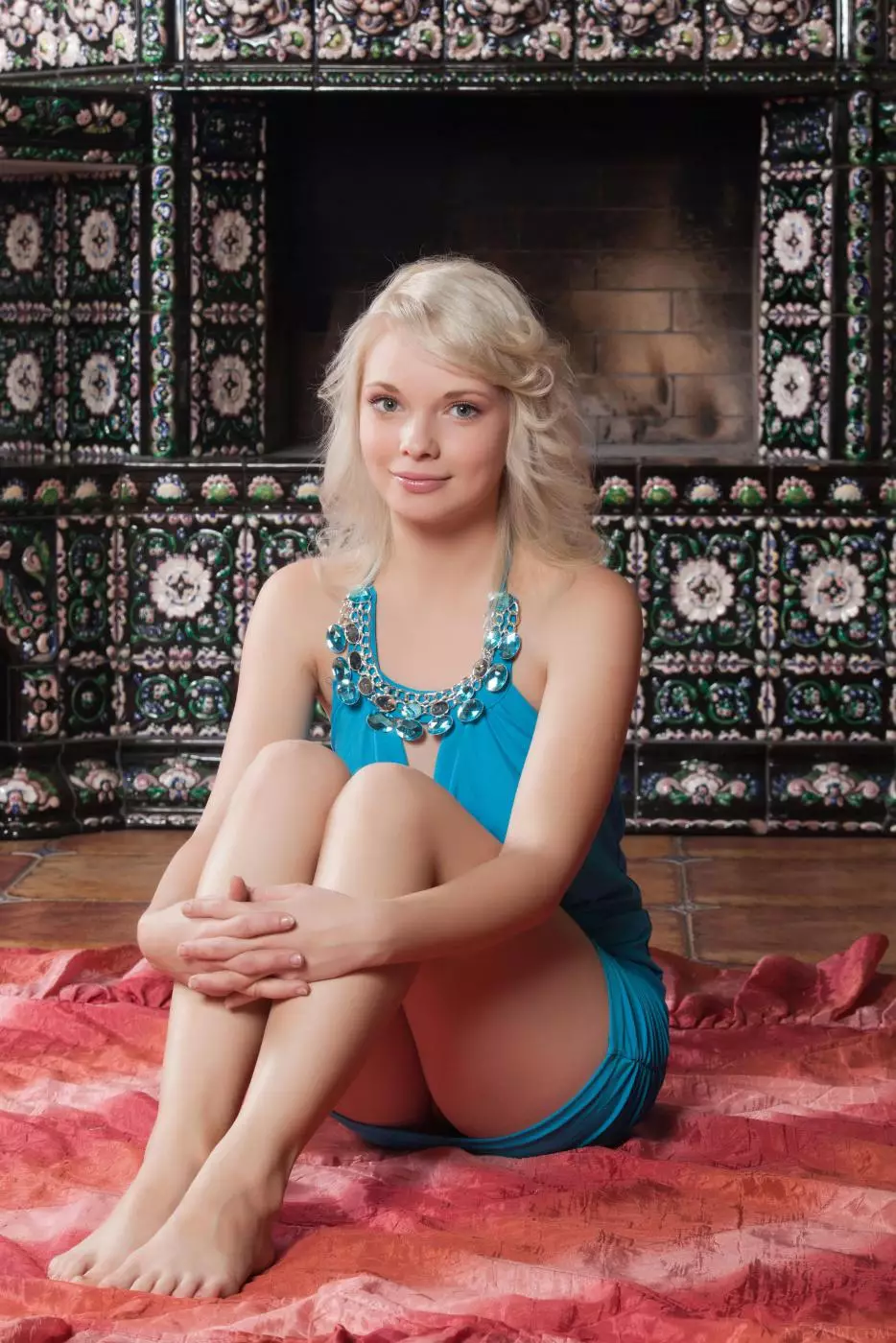 Милая блондинка Feeona A снимает синее платье и показывает бритую киску — Feeona A