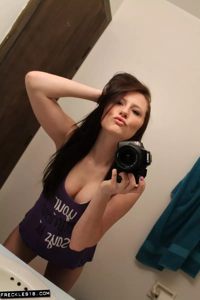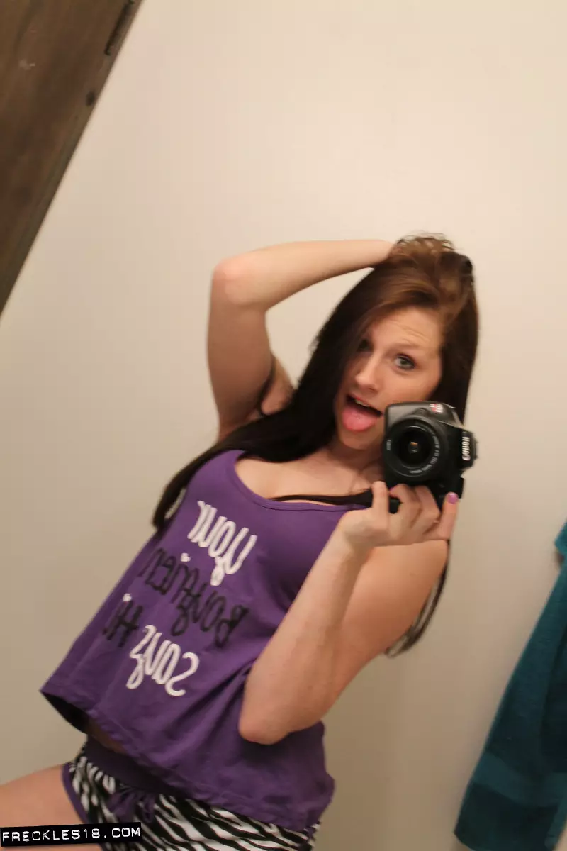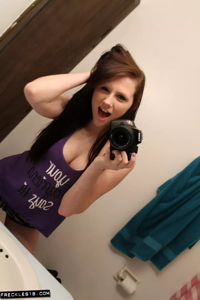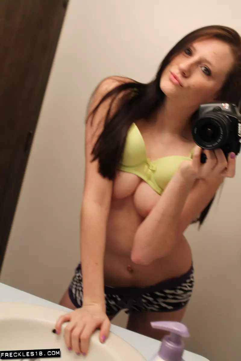 Распутная брюнетка Freckles раздевается перед зеркалом и делает развратные снимки — Freckles
